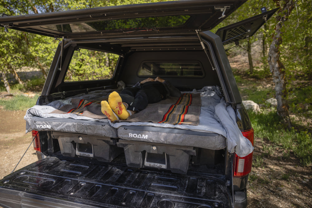 The Roam Memory Foam Mattress is a 4" dual-layer foam mattress that turns camping sleep into a dream. The top layer of the mattress is an ultra-plush foam designed for comfort while the base layer is a dense foam designed for structure and support. The dual-layer foam creates the ultimate sleeping experience and transforms your camp bed system. One of the innovative features of the mattress is its ability to daisy chain together with other mattresses giving it the ability to be a single, double, triple, or even a quad-width mattress. The base fabric is weather-resistant melange and designed to be able to be laid on just about any surface. The top is a plush stretch nylon fabric that is comfortable, tough, and cool to the touch. When you are ready to stow your mattress there are integrated compression straps to minimize the stowed size of the mattress with a carrying handle built in.